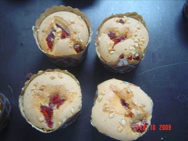 先將全蛋+細砂糖打發,加入SPˋBP及中筋麵粉拌勻,再加入牛奶ˋ沙拉油ˋ草莓乾,倒入烘烤杯中,表面灑上杏仁角及草莓乾,入爐烘烤