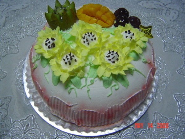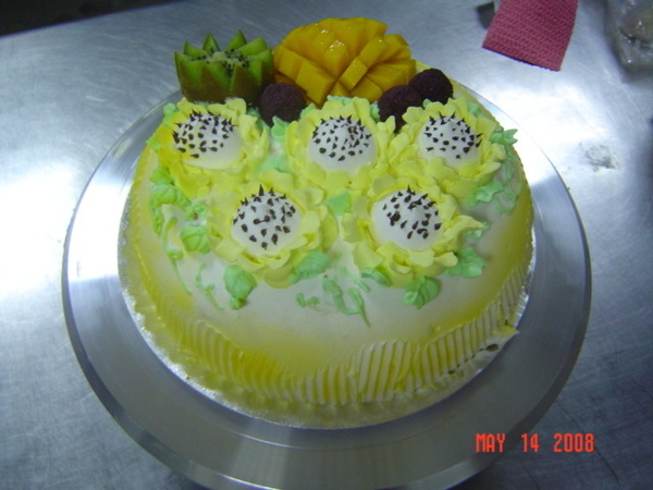 這是義興蛋糕裝飾的第一堂課-可愛小花! 我的作品 <a target="_blank" href="/album/show.php?i=ruby38111015&b=3&f=1739830859.jpg"><img border="0" src="http://pic.pimg.tw/rubywang9966/4a41dcf3a48d1.jpg"></a><br /> <br /> 同學的作品 <a target="_blank" href="/album/show.php?i=ruby38111015&b=3&f=1739830865.jpg"><img border="0" src="http://pic.pimg.tw/rubywang9966/4a41dcf4255c8.jpg"></a> 這次的蛋糕裝飾不會太難,是利用弧形的花嘴畫出來的,邊邊噴上巧克力粉,我個人覺得黃色的小花,蛋糕邊噴上黃色比較好看!