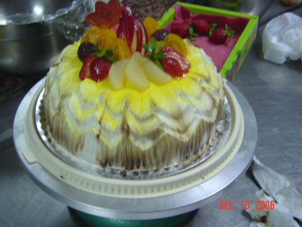 這也是一個圓形蛋糕的變化,比較特殊的地方是旁邊三角形的部分,就讓這個蛋糕漂亮多了,漸層的感覺,再噴上巧克力粉, 擺上水果,完成!