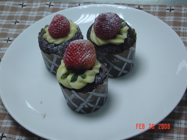 ,將中間挖空, 擠上卡士達醬,放上草莓做裝飾,灑上糖粉!這個蛋糕老師用了SP, 口感沒有很綿細,所以,我會把這個蛋糕體換成綿細口感的