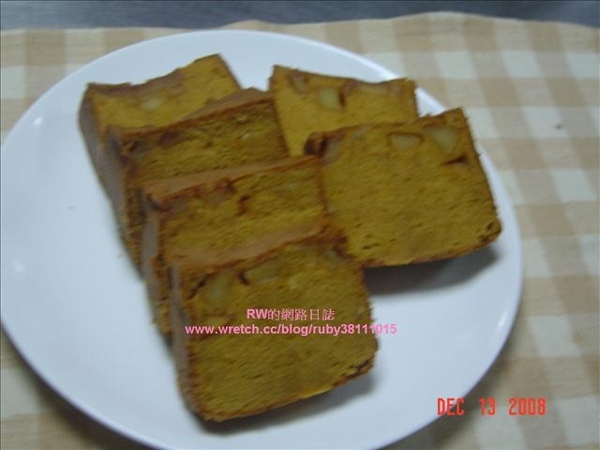 這款焦糖蘋果屬常溫蛋糕,先把蘋果內餡料煮好,放冷之後,再和麵糊混在一起,吃起來有蘋果香,口感屬軟綿,很適合做聖誕蛋糕啦!