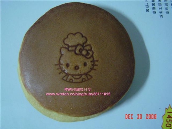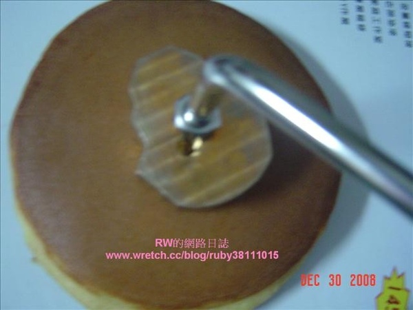用這個烙印第一次烙印加太熱,蓋得太用力,所以,銅鑼燒連皮被我剝下來了,第二次再加熱烙印把它加熱至有一點變色(會有偏紅的感覺),然後輕輕的壓在銅鑼燒表面上,蓋出來就如上圖水吧!