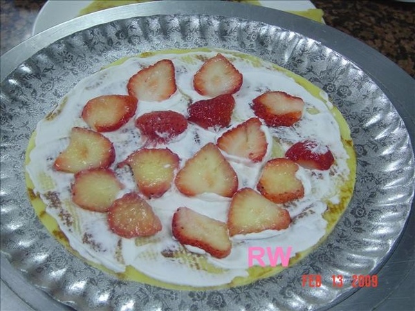 放一片煎好的蛋皮,抹上鮮奶油,再把切片的草莓鋪滿蛋皮上,要鋪好幾層喔!