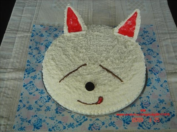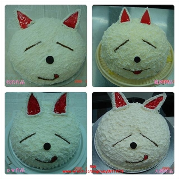 我喜歡玩蛋糕,做蛋糕裝飾,這次做的是賤兔,蛋糕修圓,抹上鮮奶油,用細線條鮮奶油擠滿整個蛋糕,