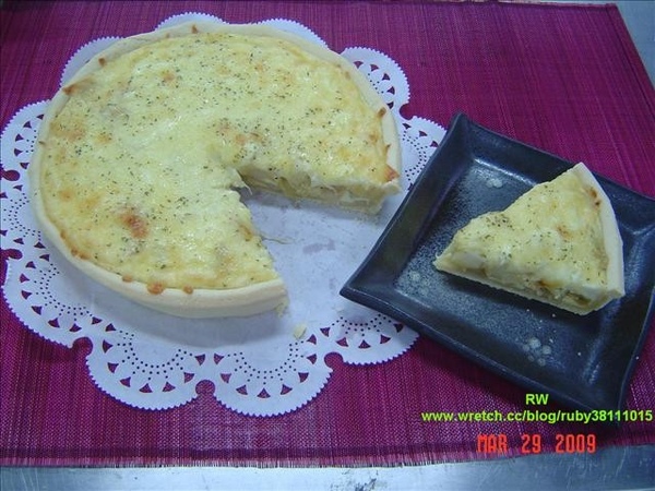 這次是為蝦仁派而來的,蘋果派之前學過了,這次是稍微複習一下,順便看一下不同的手法,果然每個老師都會有自己的撇部,蝦仁派一樣是先做內餡,鍋中放油,加入洋蔥炒軟,馬鈴薯丁ˋ蝦仁加入拌炒,再加入調味料調味,這個內餡吵起來好香,覺得就像是道下飯的菜