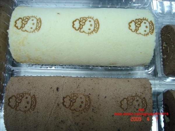 烙印加熱然後輕壓在蛋糕卷上,可愛的圖案出來了(KT)