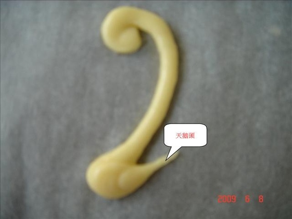 擠天鵝的脖子和頭需要一點小技巧,做法像是要寫數字2,脖子的粗細ˋ長度要注意,做的太短ˋ太粗,天鵝會變得呆呆醜醜的,收口也要注意,嘴部要做出來,天鵝組裝時,才會"水"啦~