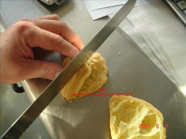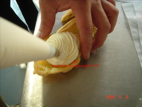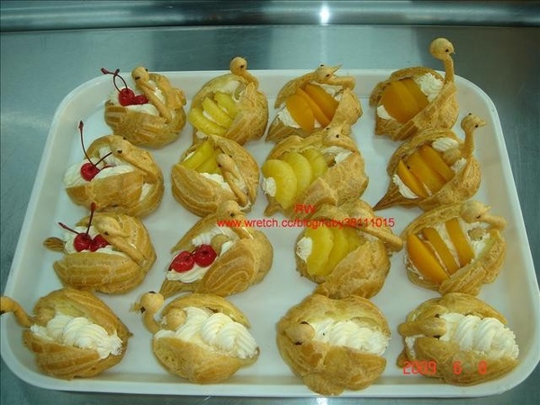 這個水果天鵝泡芙金勾錐~做法也不是太難,首先,水+油煮沸,加上麵粉拌至底部出現薄膜後,蛋汁分次加入拌勻,形成麵糊,用花嘴擠出2個部分-身體&脖子,入烤箱烘烤~