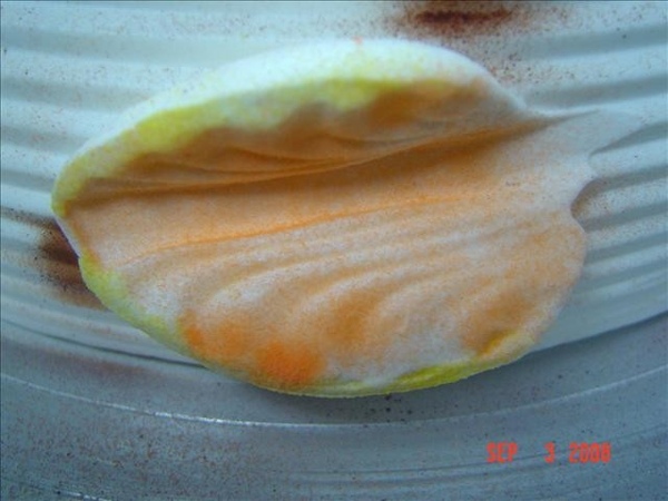 ,要用這個做出蛋糕的花樣,首先,蛋糕剪圓,抹上鮮奶油,用軟刮板修成圓形的,再用鋸齒刮板刮出線條,色粉在邊邊噴,噴出一上一下約5元硬幣大小,再用工具做出葉形花樣,葉形邊邊先噴上色粉,貼在蛋糕邊上,再噴上色粉於葉片中間,做出雙色的樣子