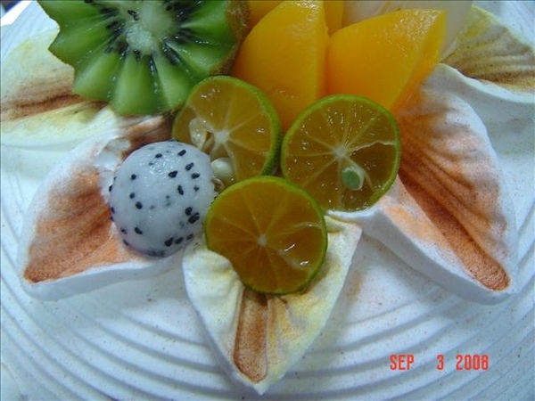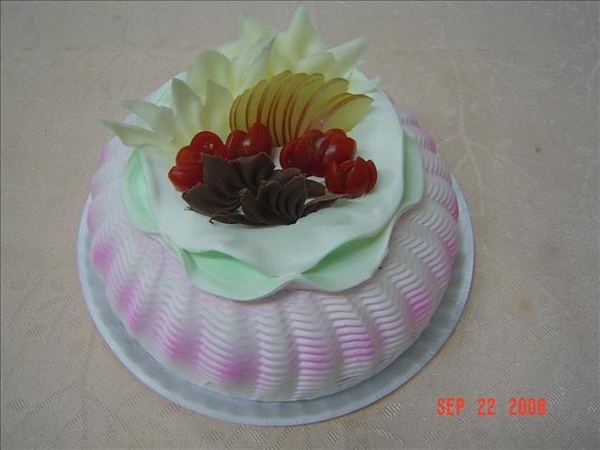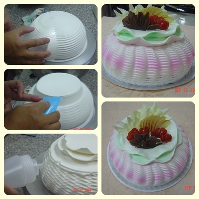 這個蛋糕非常的需要技巧要多練習,上面薄薄的兩片,真是搞死人了,先在蛋糕上抹出立體圓形,然後用刮板刮出片狀,而且要做兩層,要把鮮奶油分割開來,變成薄片狀,(一定要薄)不然無法用吹瓶吹出波浪狀!