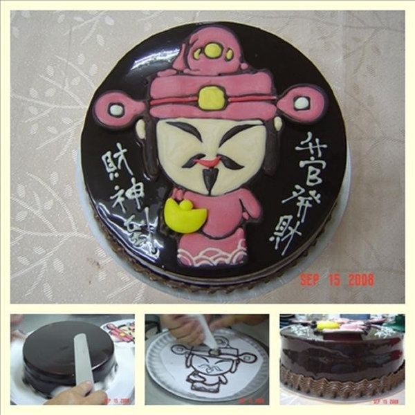 做好的財神圖案要趁巧克力醬淋下未乾時,放在蛋糕上,再用白巧克力在旁邊寫上~財神到ˋ升官發財~