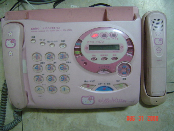 這個KT傳真機是日本三洋出品的,是KT和小花的圖案,除了有傳真的功能和答錄機(左邊的部分),還有無線電話(右邊的部分),收訊效果非常好,使用好幾年了,我非常喜歡!